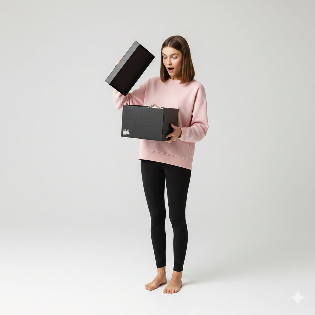 Uma caixa exclusiva (tamanho M ou G dependendo do tamanho dos produtos)